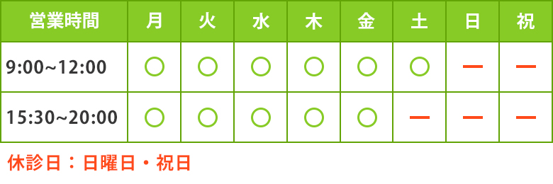| 営業時間 | 月~金 【午前】9:00~12:00 【午後】15:30〜20:00 |