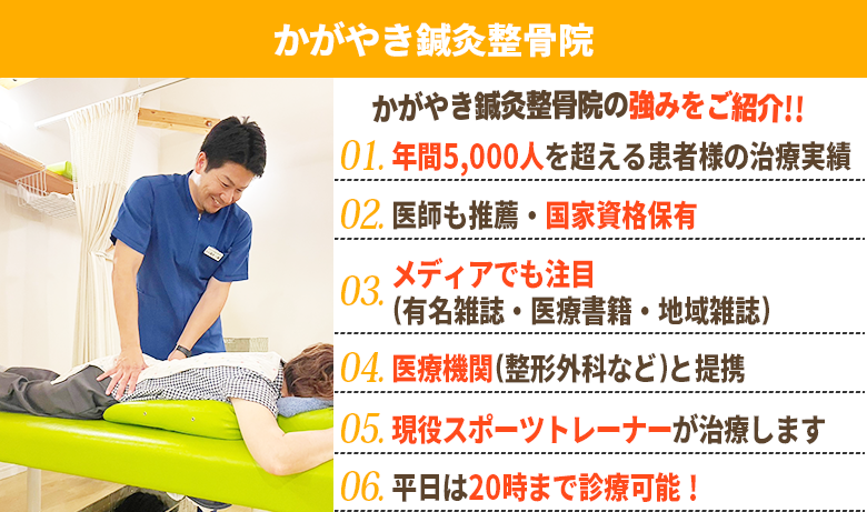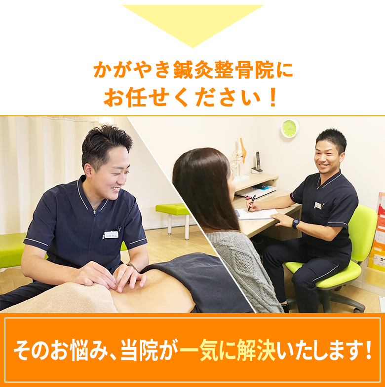 かがやき鍼灸整骨院なら身体の痛みや不調によって日々つらい思いをしているあなたのお悩みを解決することができます。